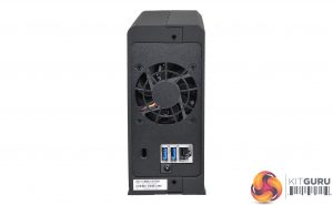 There are three indicators; System Status, Network and Disk activities. There are no ports on the front panel, the two USB 3.0 ports are at the bottom of the rear panel just under the grill for the 60mm cooling fan.