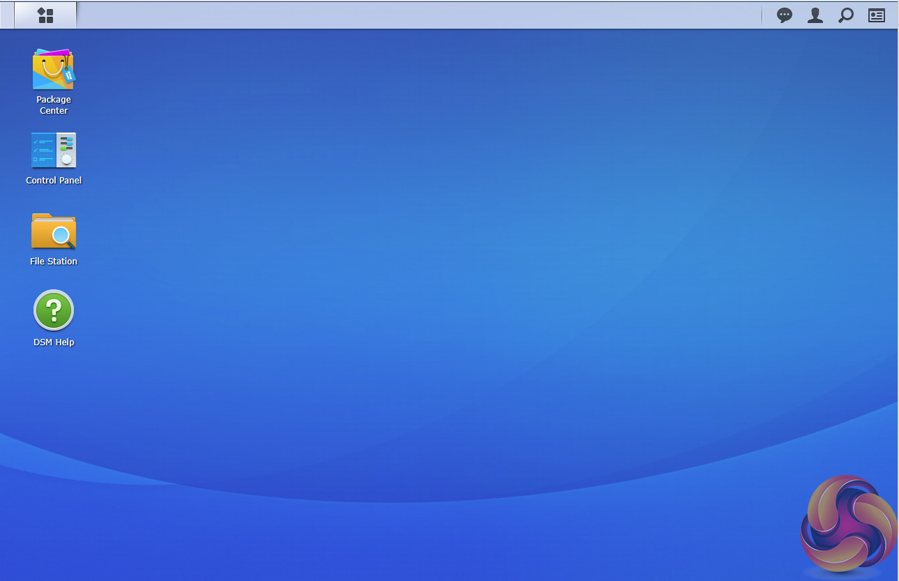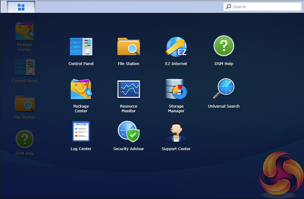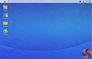 The basic start page just lists four items; Package Center, Control Panel, File Station and DSM help. Clicking on the left-hand top tab opens a small window with more advanced menu choices than the basic one.