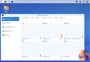 The Resource Monitor is an easy to use tool to keep an eye on the DiskStation’s resources. With it you can monitor CPU usage, memory usage, disk utilization and network flow in real time or historically.