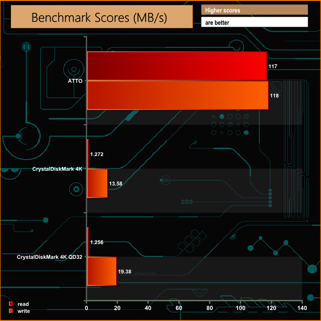 Synology quote Sequential performance figures for the DiskStation DS118 as 113MB/s for reads and 112MB/s for writes, figures we confirmed with the ATTO benchmark. The review unit produced figures of 117MB/s for reads with writes coming in at 118MB/s.