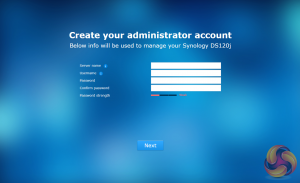 After the basic install has finished, the NAS is restarted and next up comes the setting up of the NAS account management, where you assign a server name, admin user name and password. The next window is where the DSM update settings are set.