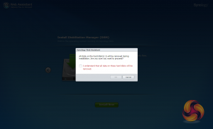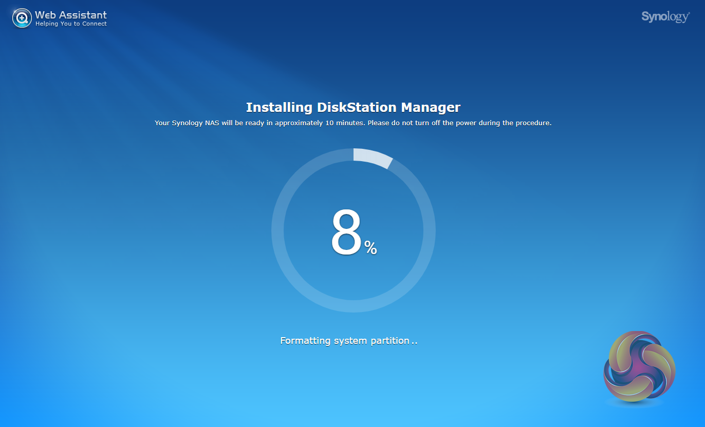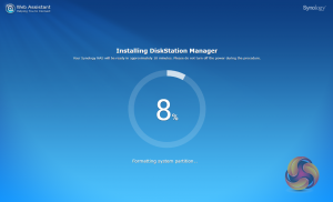 Once the NAS is found, the first window of the DSM setup wizard appears. Pressing install (there’s also a manual install option to install a downloaded instance of DSM) automatically downloads the latest version of DSM and starts installing it after reminding you that any data on the hard disk will be deleted.