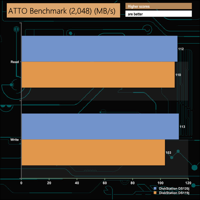 Synology's official Sequential throughput figures for the DS120j (fitted with a Seagate ST6000VN0001 6TB drive) are 112.69MB/s for reads and 106.99MB/s for writes. Using the ATTO benchmark we could confirm speeds and even squeezed a little more write performance out of the unit using a single 6TB WD Red drive (WD60EFRX).