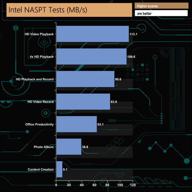 Intel’s NASPT (NAS Performance Toolkit ) is a benchmark tool designed to enable direct measurement of home network-attached storage (NAS) performance. NASPT uses a set of real-world workload traces (high definition video playback and recording, video rendering/content creation and office productivity) gathered from typical digital home applications to emulate the behaviour of an actual application.