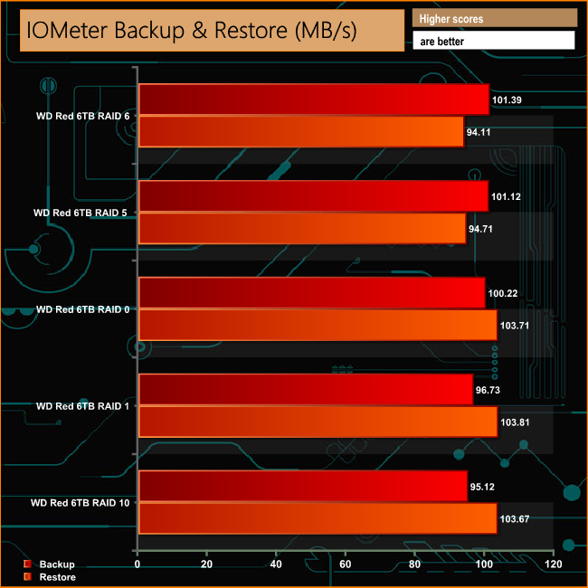 We set IOmeter up (as shown above) to test both backup and restore performance on a 100GB partition.