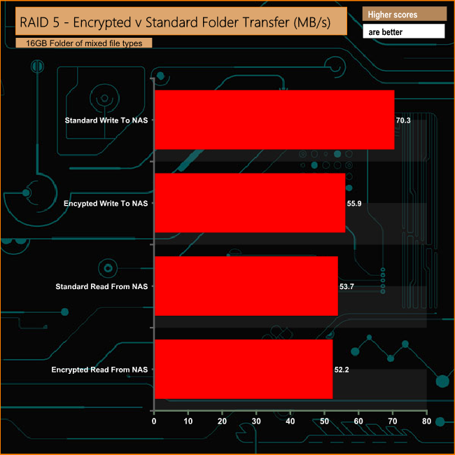 Thanks to the DS1517+ built in encryption engine there's only a 14MB/s drop in performance writing an encrypted folder to the NAS. Reading the encrypted data back there's hardly any loss in performance.
