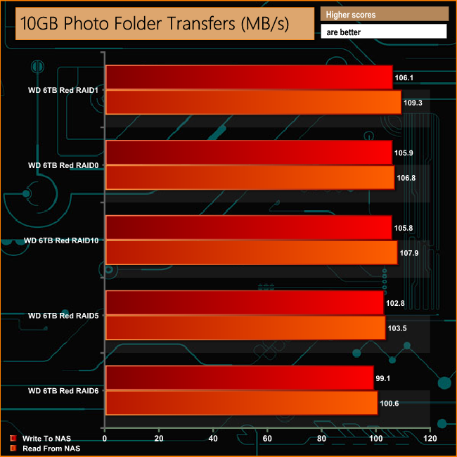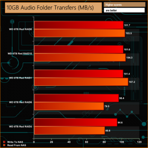 The Synology DS1517+ performed well in all our real life transfer tests. During the 60GB Steam folder test it got very close to the 100MB/s mark for reads and over 80MB/s for writes for all arrays except RAID 6 where the performance dropped off for both reads and writes. It was the same story in the 50GB File folder transfer with pretty good performance across the arrays apart from RAID 6.