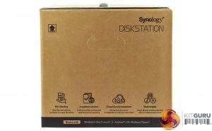 The front of the box has a label in the top left corner with an image of the drive on it along with the unit version and which memory model it is. Under this image is a row of five icons describing the CPU, the number of LAN ports, options for the PCIe slot and the fact that the DS1517+ supports the Btrfs file system.