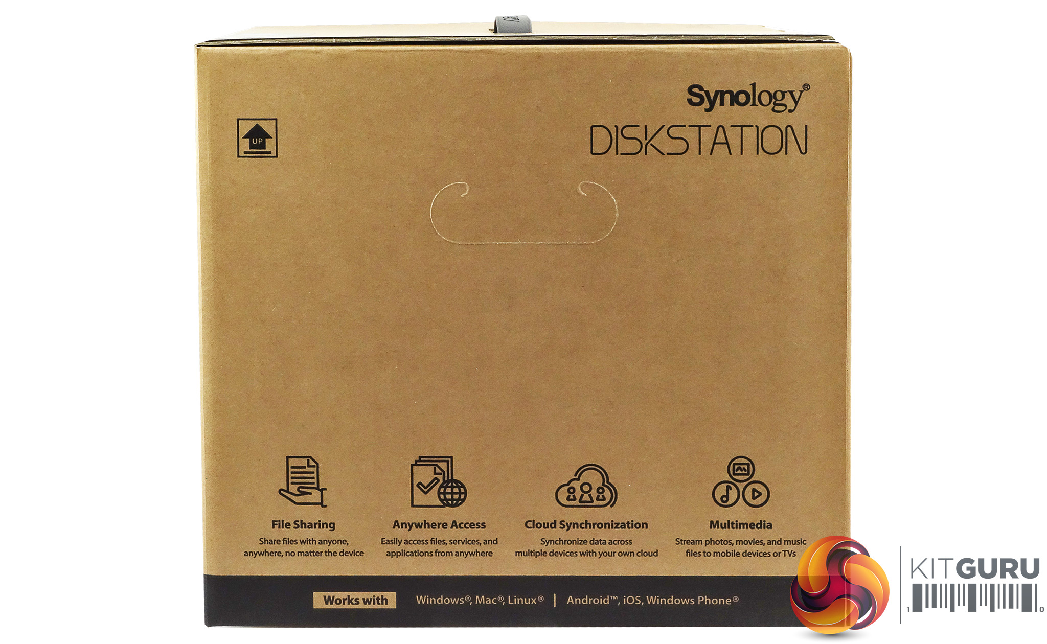 Both sides of the box feature a row of feature icons along the bottom. One side these display icons for Mobile Management, Surveillance, Backup, Data Security while the other side features File Sharing, Anywhere Access, Cloud Synchronization and Multimedia.