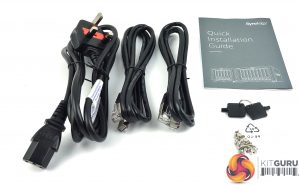 The box bundle is a simple affair with just a mains cable, a pair of good quality Ethernet cables, two keys for the drive bay locks and mounting screws if 2.5in drives are being used. There also Quick Installation guide included.