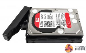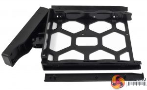 The drive trays have physical locks and activity LEDs built into the tray doors. The trays are constructed from plastic and are tool free for 3.5in drives with drives being held in place by plastic strips that have moulded spikes on them which fit through rubber grommeted holes in the drive tray sides and into the drive. 2.5in drives are fitted via screw holes in the tray base.