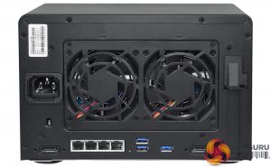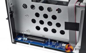 To the right of the fans is the blanking plate for the PCIe slot while under them sit the four LAN ports and three USB 3.0 ports together with the reset button. To either side of these ports is an eSATA port.
