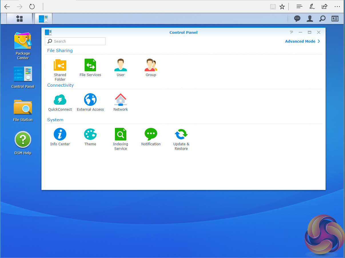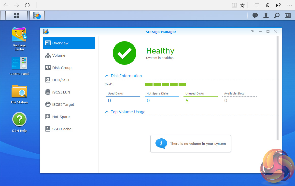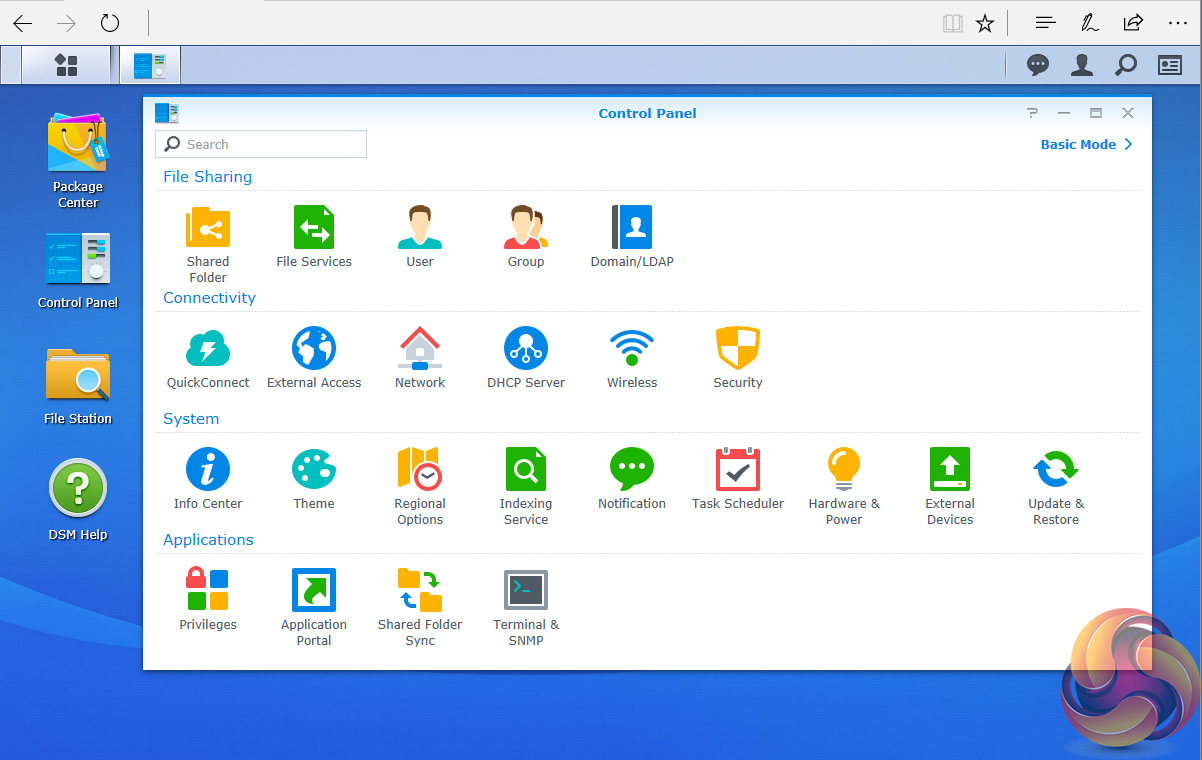 DSM has a graphically rich interface with all the major features of the OS clearly listed. The basic start page just lists four items; Package Center, Control Panel, File Station and DSM help.