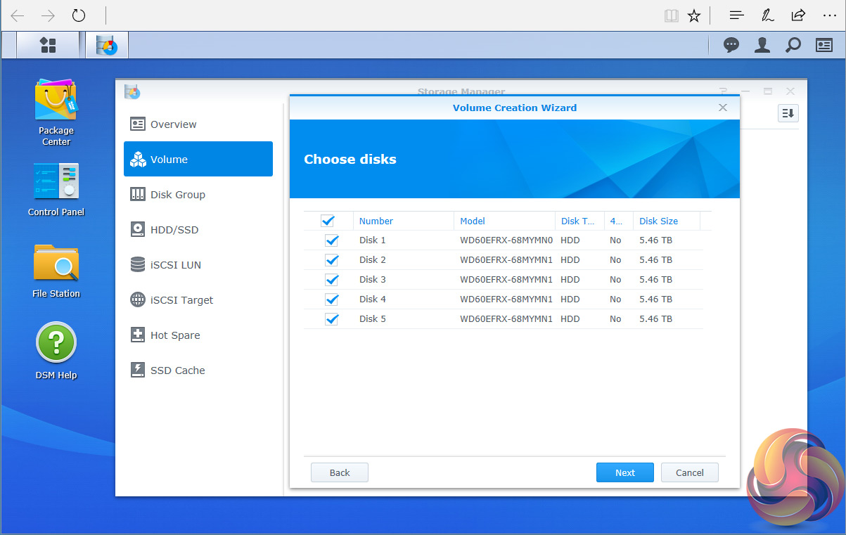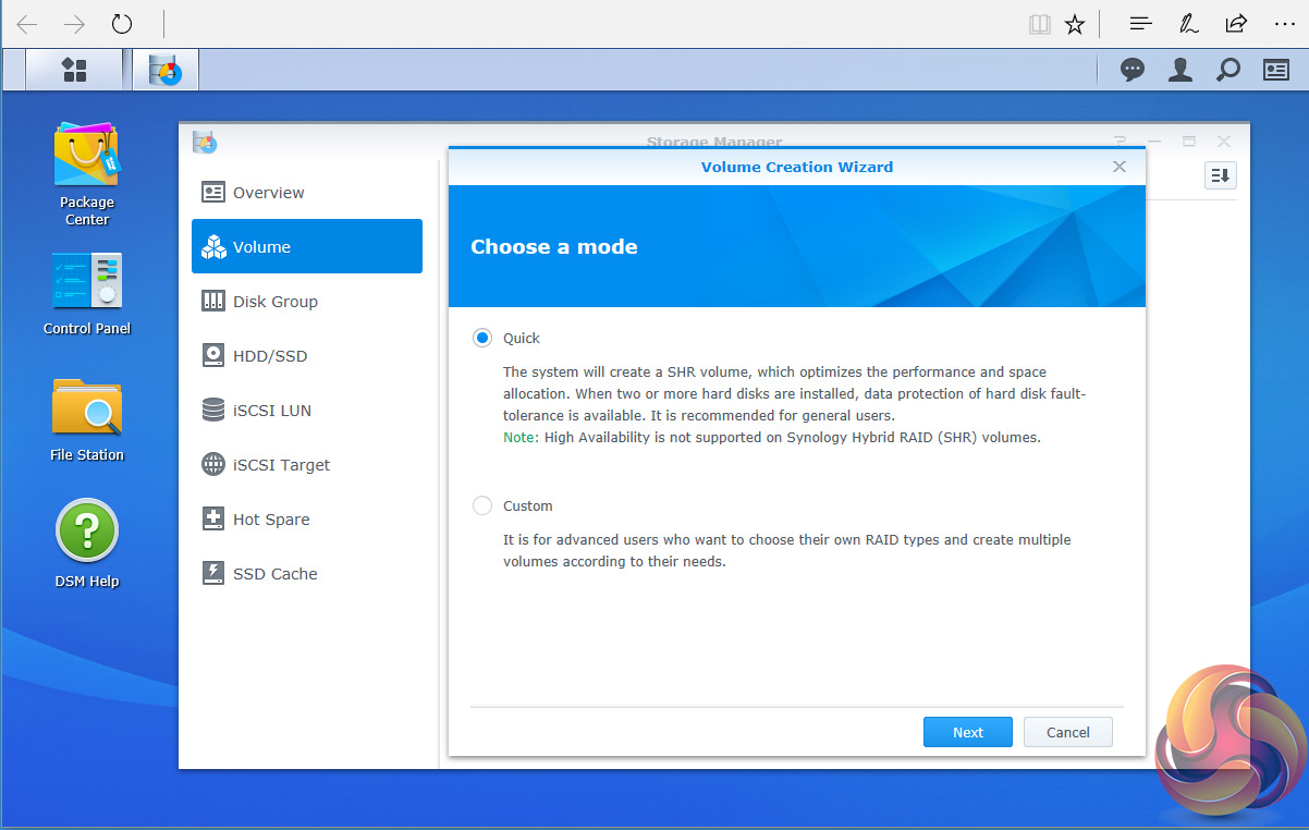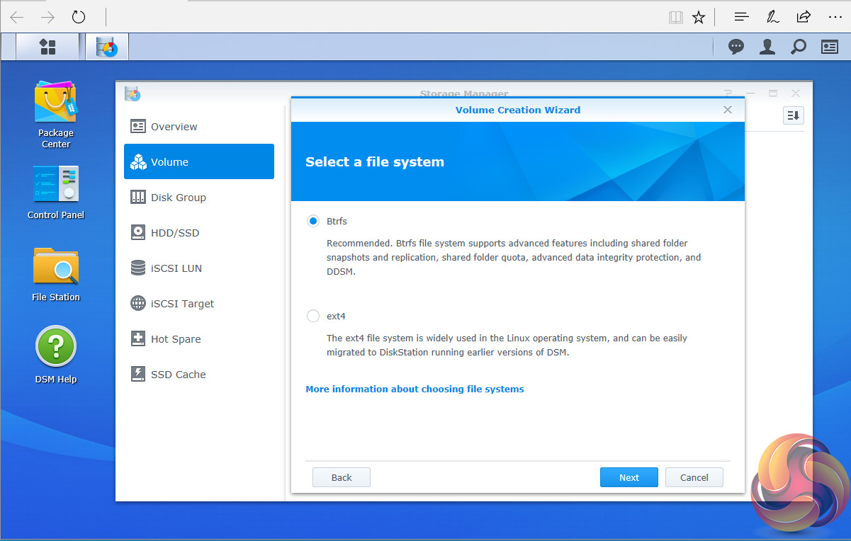 At the heart of DSM is Storage Manager. Storage Manager looks after RAID setups, volume creation (choose between Btrfs or ex4) and all other disk management duties.