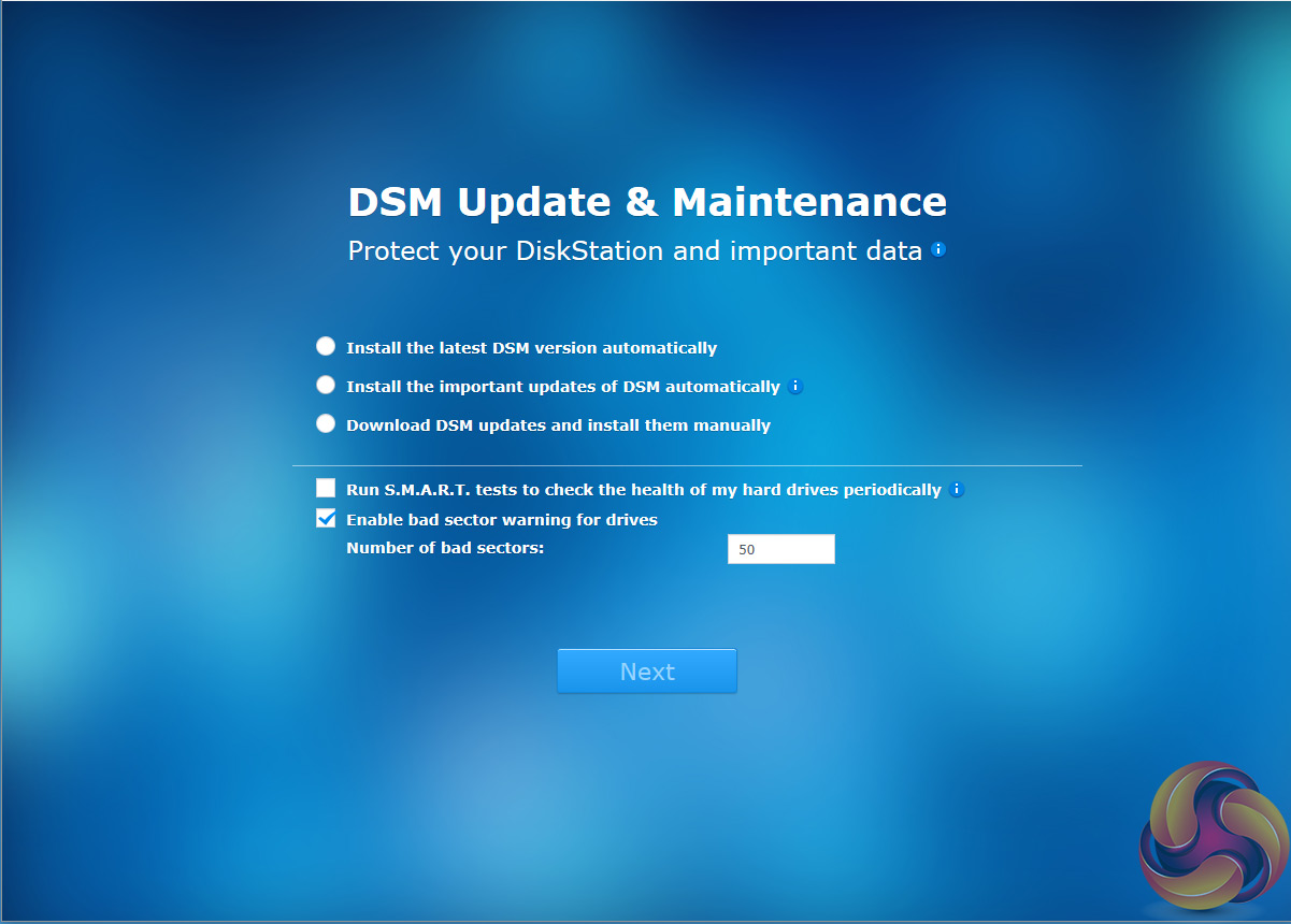 After the basic install has finished, the NAS is restarted and next up comes the setting up of the NAS management, where you assign a server name, admin user name and password. The next window is where the DSM update settings are set.