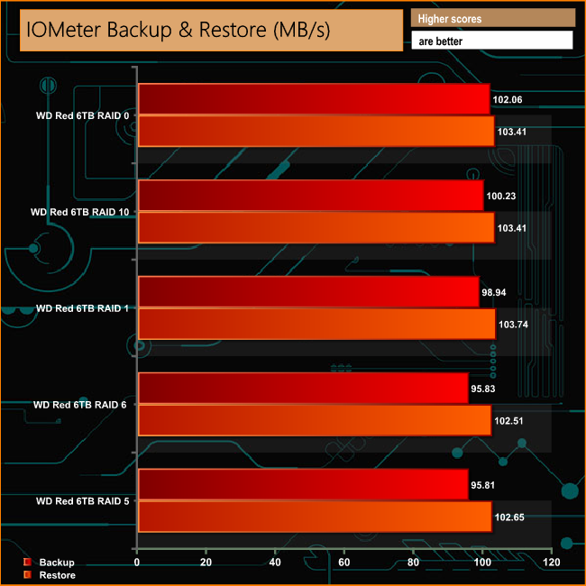 We set IOmeter up (as shown above) to test both backup and restore performance on a 100GB partition.