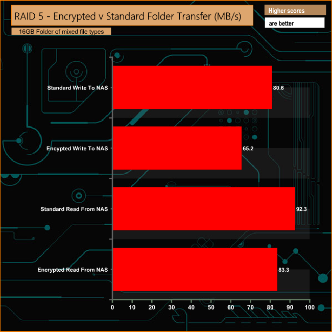 The AES-NI hardware encryption engine in the DS1817+ helps maintain performance levels when the NAS is dealing with encrypted files. The write performance dropping just 15MB/s with reads losing a mere 11MB/s when tested in RAID 5 mode.