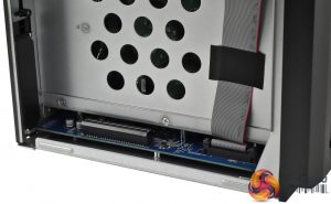 To the right of the fans is the blanking plate for the PCIe slot while under them sit the four LAN ports and three USB 3.0 ports together with the reset button. To either side of these ports is an eSATA port.