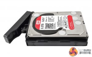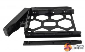 The drive trays are made from good quality plastic with the 3.5in drives held in place by simple but effective method. A plastic strip with a pair of pins moulded in sits in each tray side. These pins pass through rubber grommeted holes (helping to reduce drive vibration) and into the mounting holes in the hard drives chassis. The trays support 2.5in drives but these have to be fixed in place with screws (bundled with the NAS) via holes in the tray bottom.