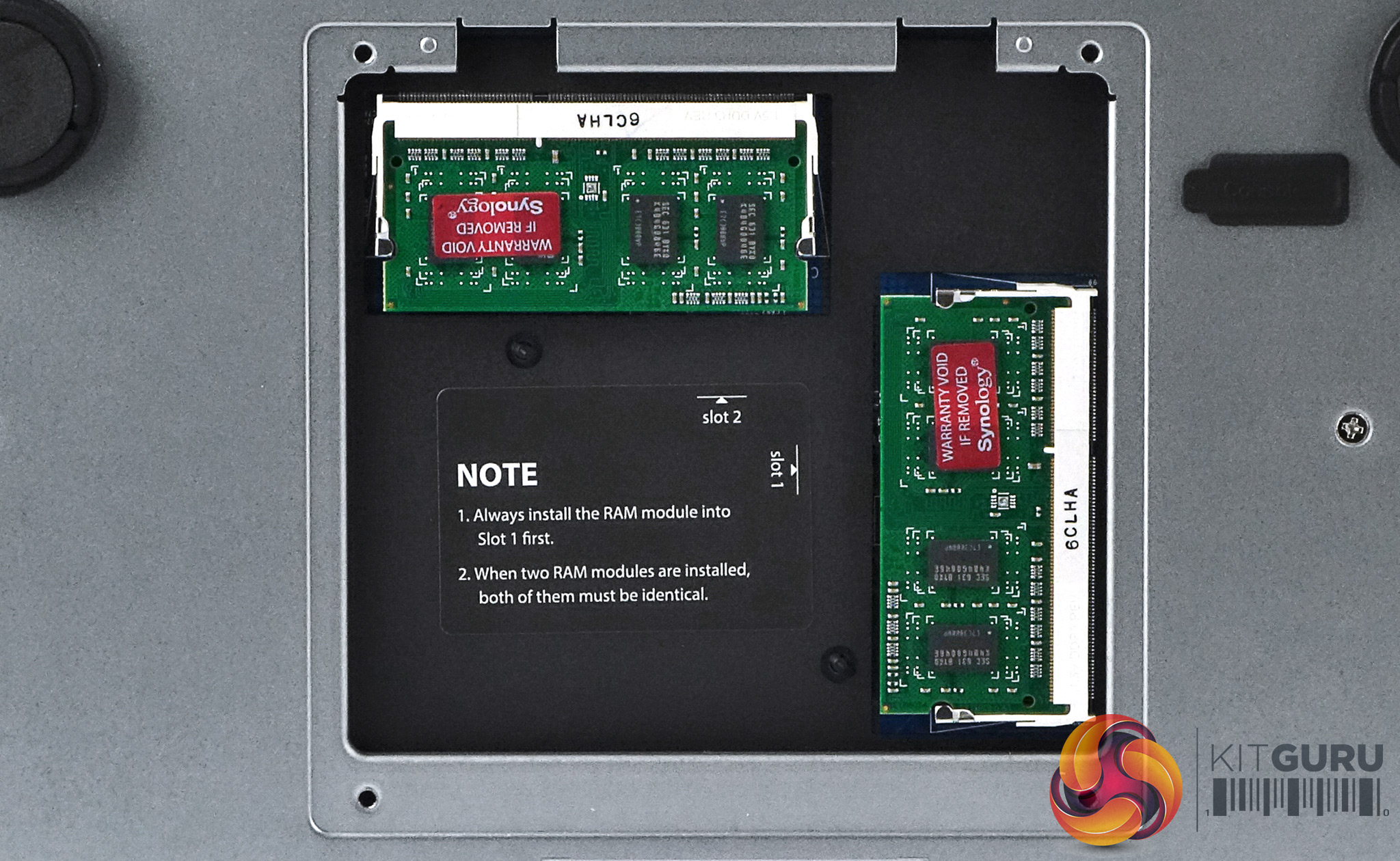 Although the DS1817+ comes in two basic memory configurations; 2GB and 8GB, the NAS actually supports up to 16GB of memory via a pair of SODIMM slots. Access to these slots is via a hatch (held in place by 4 screws) on the underside of the unit.