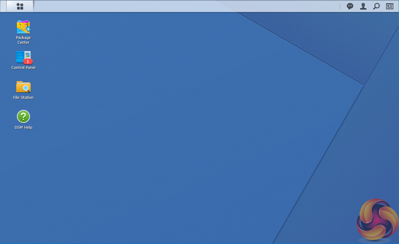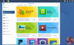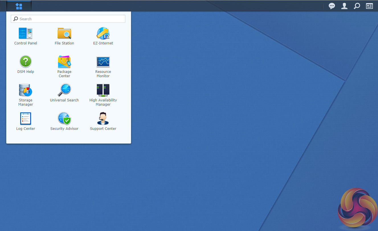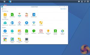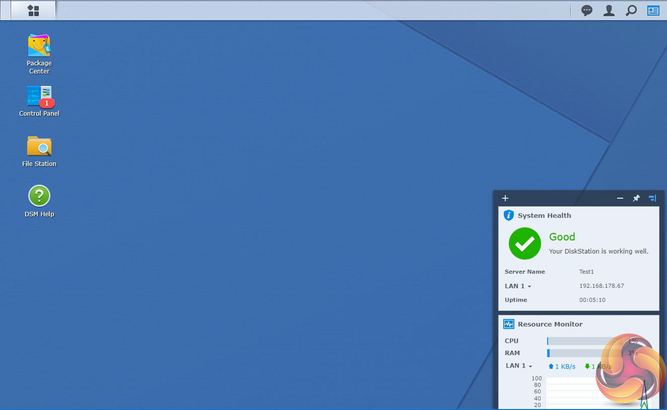 DSM has a graphically rich interface with all the major features of the OS clearly listed. The basic start page just lists four items; Package Center, Control Panel, File Station and DSM help. Clicking on the left-hand top tab opens a small window with more advanced menu choices than the basic one. Clicking on the furthest right-hand icon at the top of the window opens the System Health and Resource Monitor widgets.