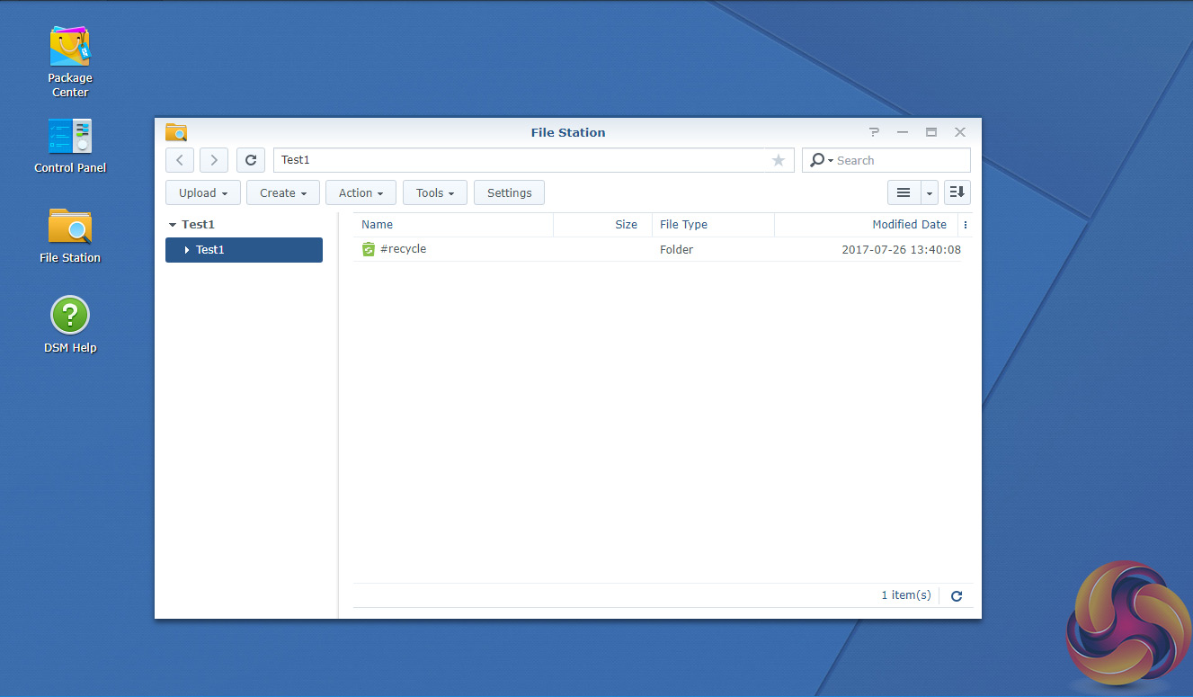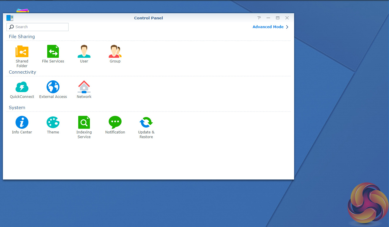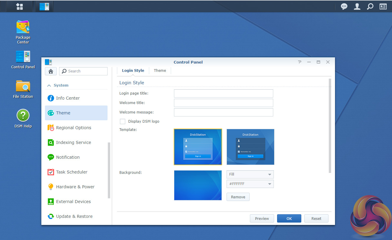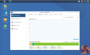 DSM has a graphically rich interface with all the major features of the OS clearly listed. The basic start page just lists four items; Package Center, Control Panel, File Station and DSM help. Clicking on the left-hand top tab opens a small window with more advanced menu choices than the basic one. Clicking on the furthest right-hand icon at the top of the window opens the System Health and Resource Monitor widgets.