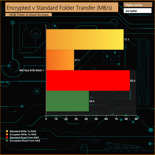 Although the DS218j comes with a hardware encryption engine, the 1.3GHz processor and the 512MB of memory struggle to reach anywhere near performance parity when dealing with an encrypted folder compared to a non-encrypted one.