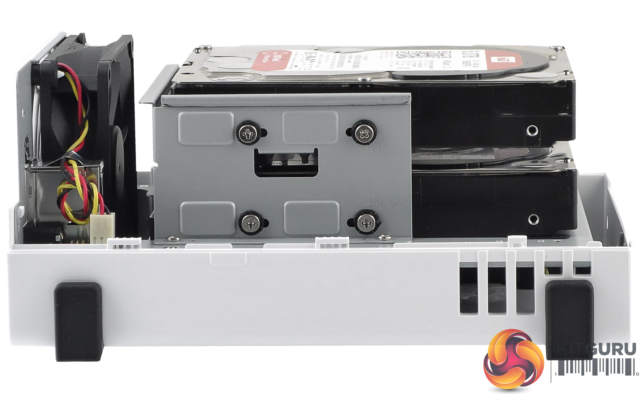 The enclosure slides apart (there's a handy sticker under the case which shows which way to slide to unlock it) revealing the drive mounts. At the time of writing this review, the DS218j supports drives up to and including 12TB of capacity.