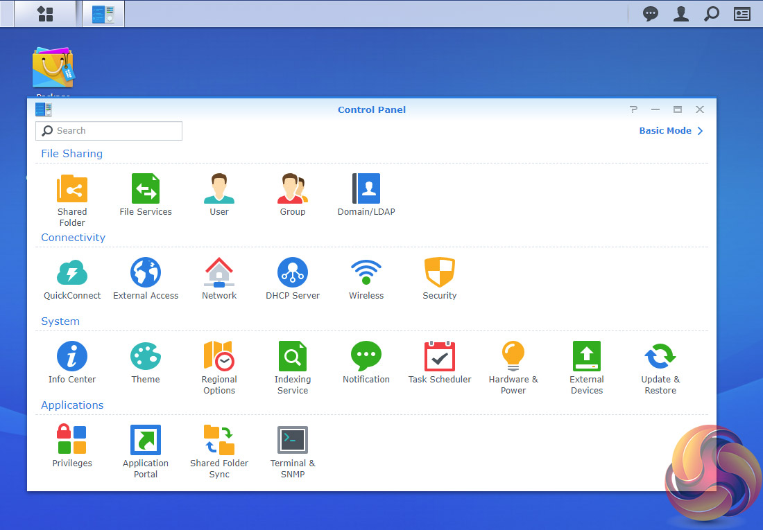 DSM has a graphically rich interface with all the major features of the OS clearly listed. The basic start page just lists four items; Package Center, Control Panel, File Station and DSM help. Clicking on the left-hand top tab opens a small window with more advanced menu choices than the basic one.