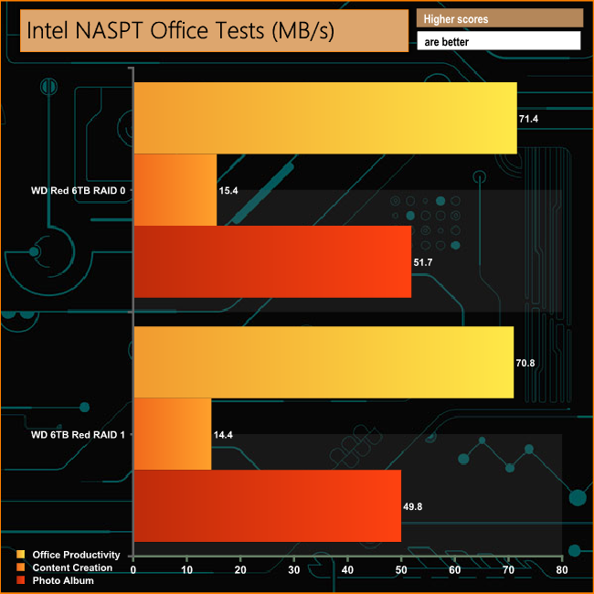 When it comes to the office tests of NASPT, the DS218j shows very good consistency across the two arrays for all three tests.