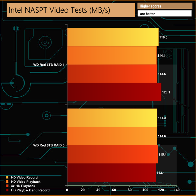 The DS218j performs very well in the video tests of Intel's NASPT benchmark, not dropping below 100MB/s for any of the tests.