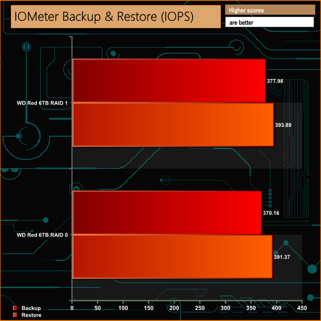 The NAS performed well in the Backup/Restore test averaging 98.06MB/s for the Backup test and 102.93MB/s for the restore runs.