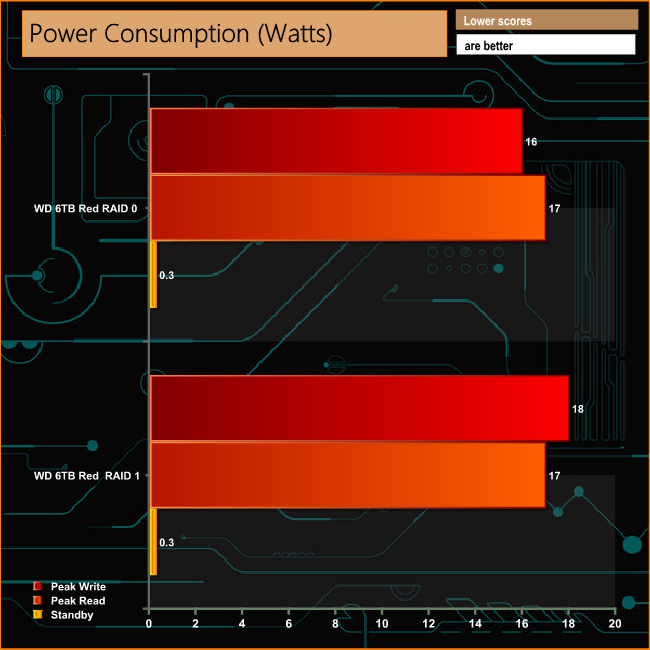 We tested the peak power consumption of a NAS at the wall during a run of CrystalDiskMark 5.0.2 as this version of the benchmark runs the read and write benchmark suites separately so its easier to monitor what power the device is using during each function.