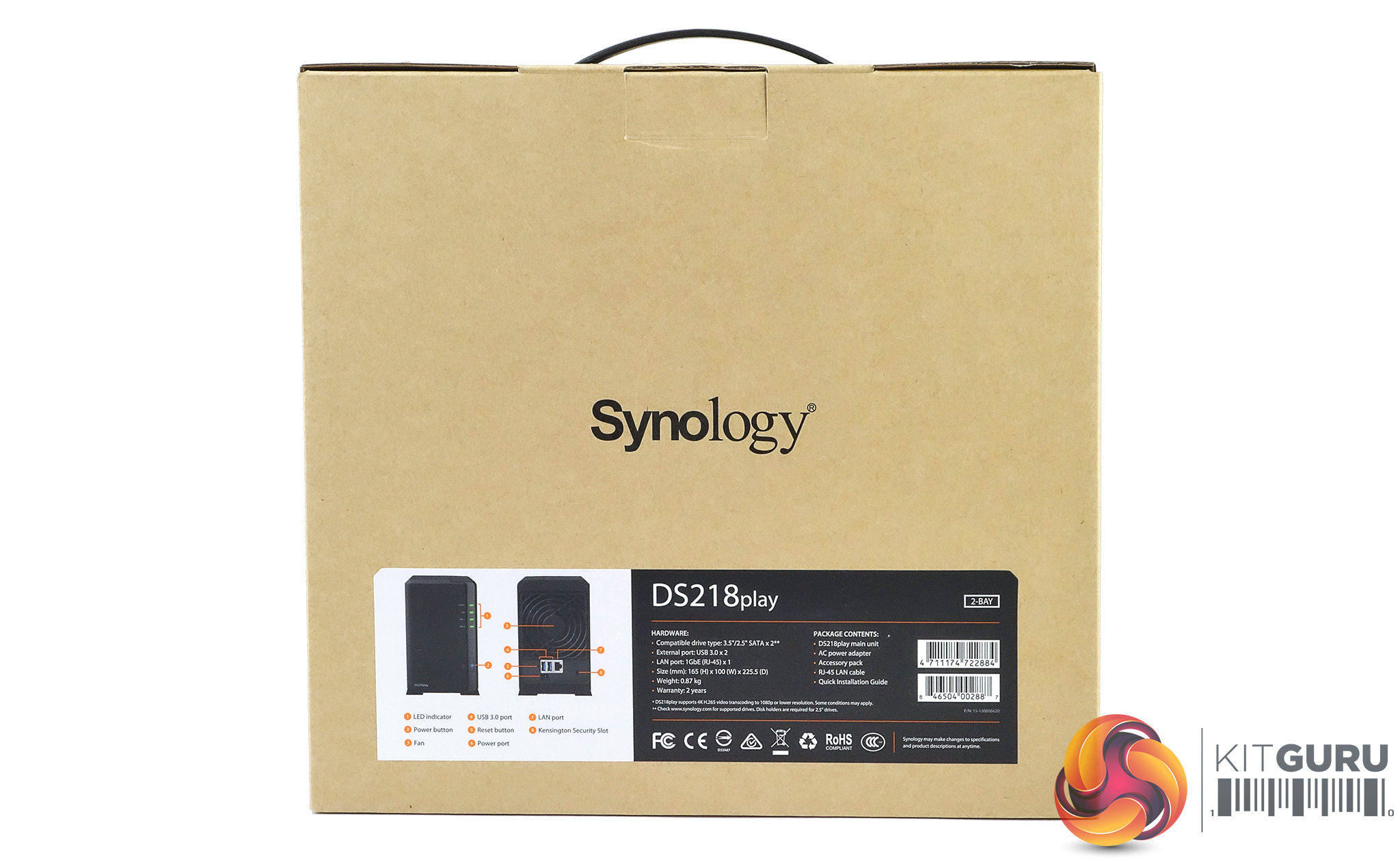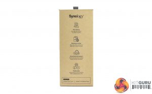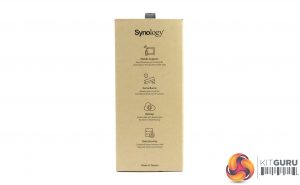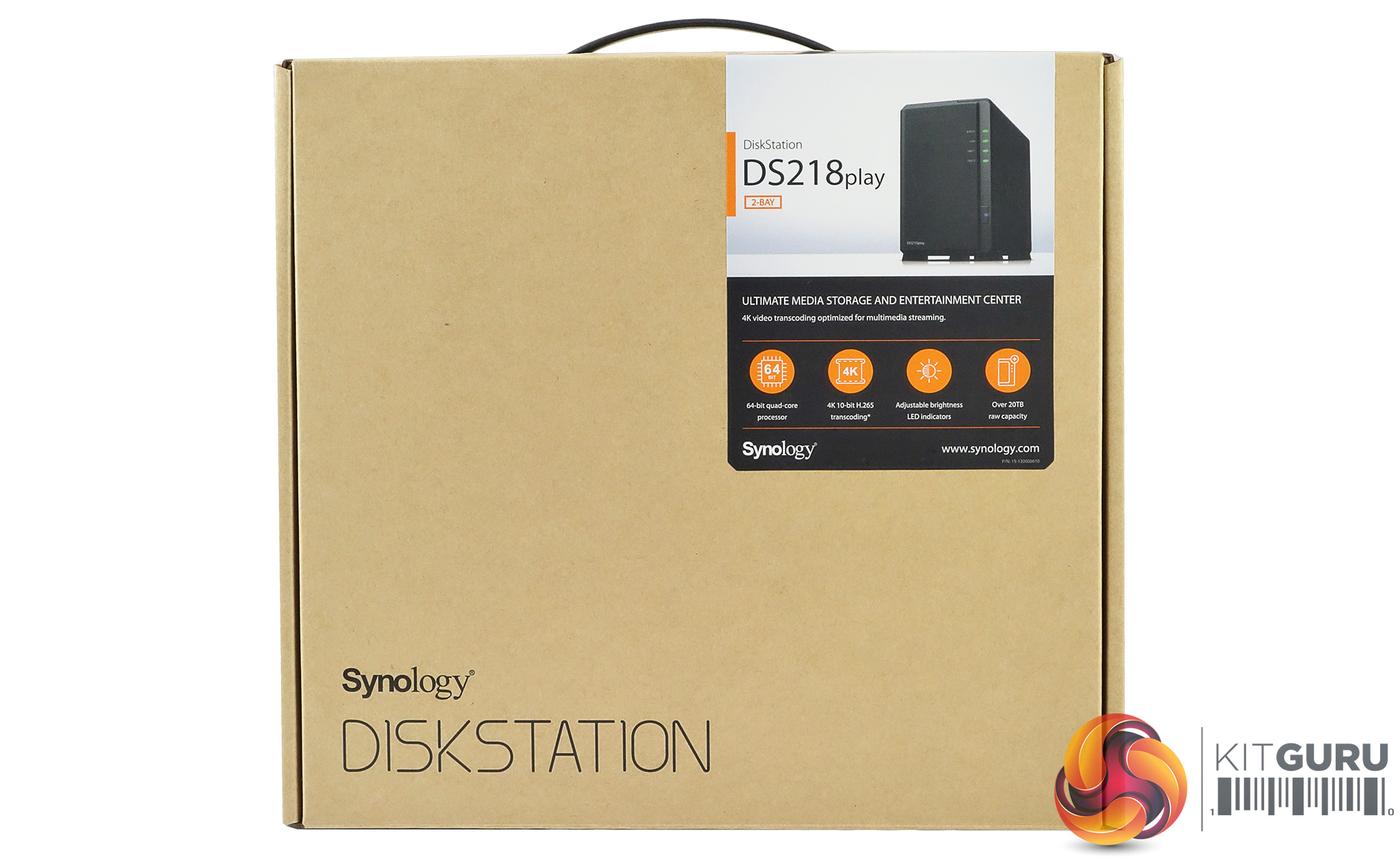The Synology DiskStation DS218play ships in a compact brown box with a sticker in the top right hand side displaying an image of the unit. Under the image are a row of icons describing some of its features; 64-bit quad-cored CPU, 4K 10-bit H.265 transcoding, adjustable LED indicator brightness and over 20TB raw capacity.