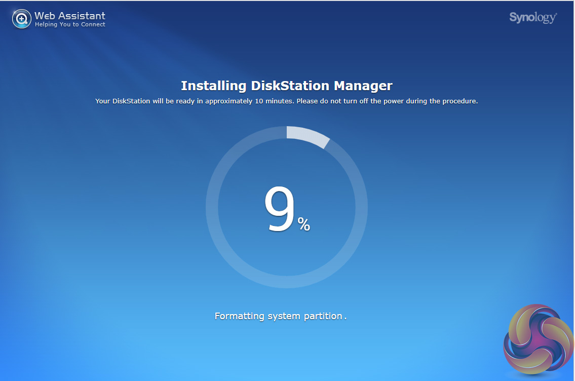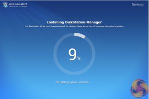 Pressing install (there’s also a manual install option to install a downloaded instance of DSM) automatically downloads the latest version of DSM and starts installing it after reminding you that any data on the hard disks will be deleted.