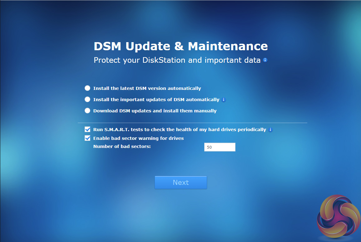 After the basic install has finished, the NAS is restarted and next up comes the setting up of the NAS account management, where you assign a server name, admin user name and password. The next window is where the DSM update settings are set.