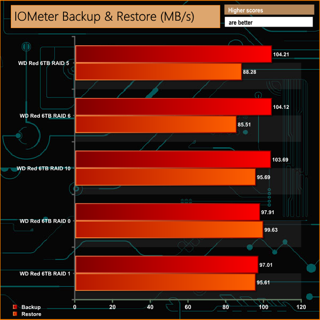 We set IOmeter up (as shown above) to test both backup and restore performance on a 100GB partition.