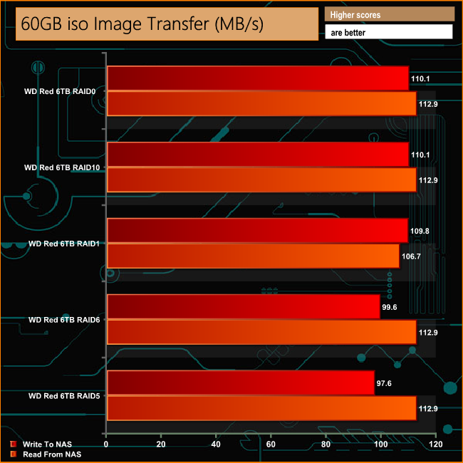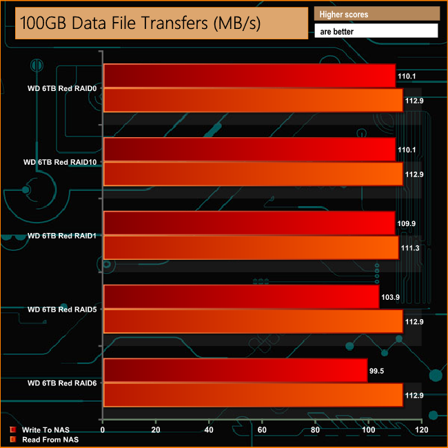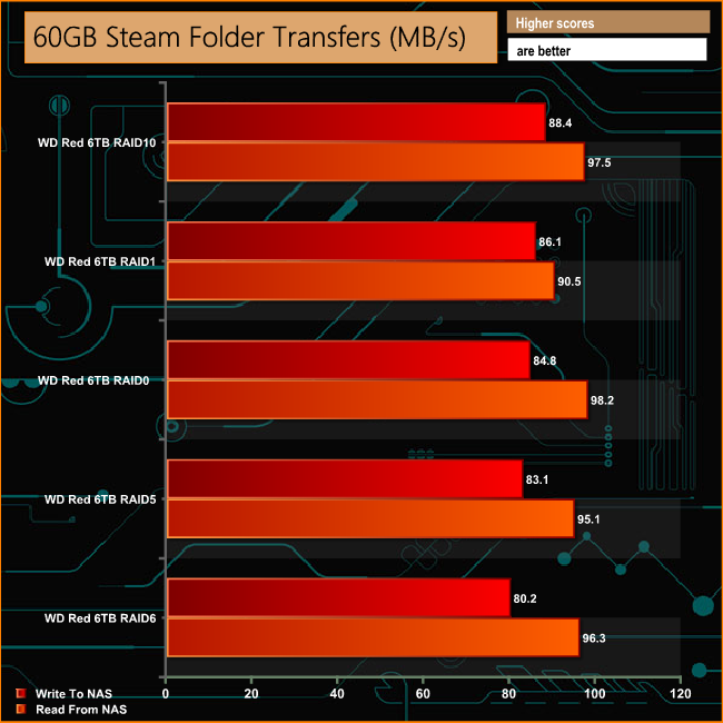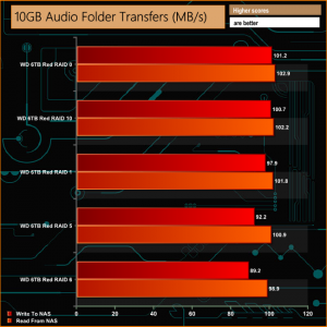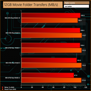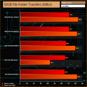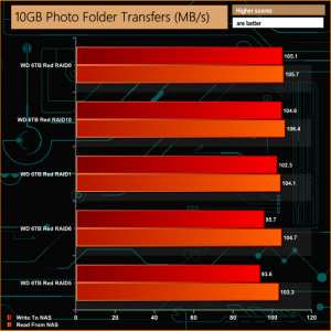 The DiskStation DS418j performed strongly during our real life testing, topping or getting very close to 100MB/s for a great many of the tests. The one test where the performance did fall of a cliff was when the data was being read back from the NAS in a RAID 6 array during the 50GB File Folder test where the performance dropped to 43.3MB/s.