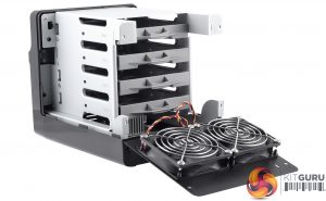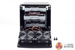 The rear panel of the unit is split in two with the top 3/4 hinged and held in place by four thumbscrews. Once you undo the thumbscrews and drop the rear panel down, the lack of front drive doors becomes apparent – this is a rear loading NAS! The four drive trays are stacked horizontally and are not tool free nor do they support hot swapping.