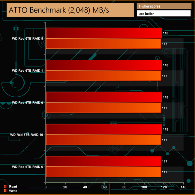 The tested unit giving 118MB/s for reads and 117MB/s for writes when benchmarked in a RAID 5 array.