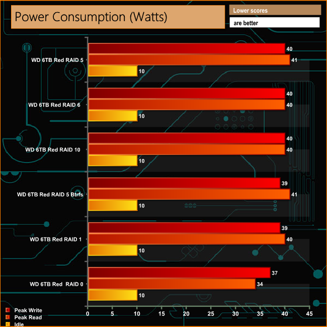 With a CPU having a TDP of just 6W and four drives using an average of 6.4W when in Read/Write mode, 5.2W in idle mode and a standby mode of 0.7W, the DS916+ was never going to be that power hungry.
