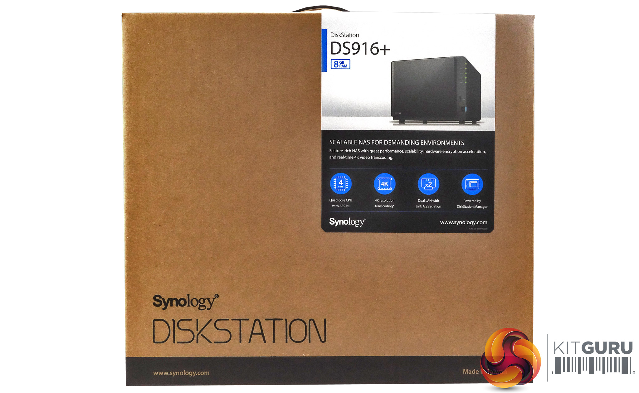 The Synology DiskStation DS916+ arrives in a smallish brown box with a label on the top right-hand corner. There is also an image of the unit detailing which memory version it is. Also displayed on the label are four feature points of the NAS; Quad core CPU, 4K transcoding support, dual LAN and the DSM OS.