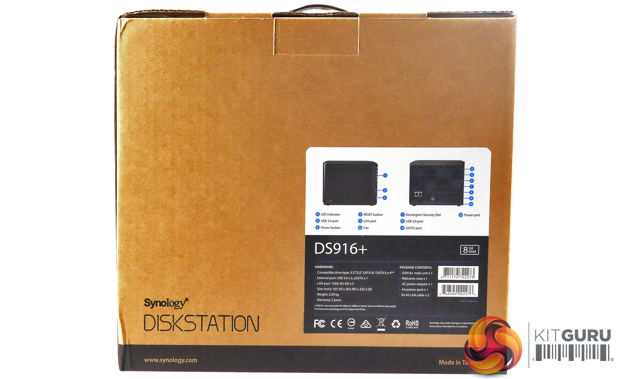 The rear of the box has a label in the bottom right-hand corner and this has front and rear images of the DS916+ with spot points of the various ports and LEDS. Under this sits a hardware and box contents panel.