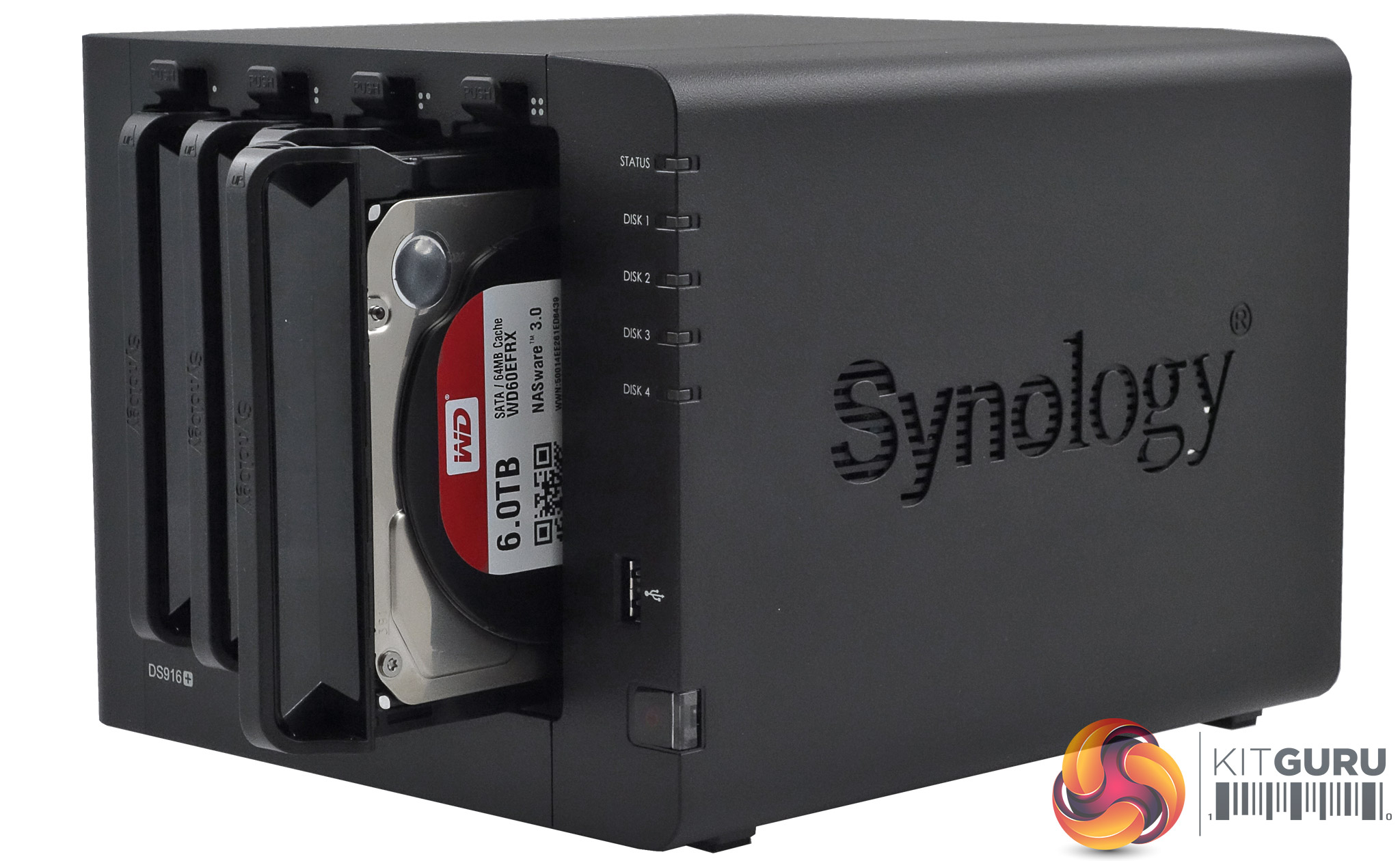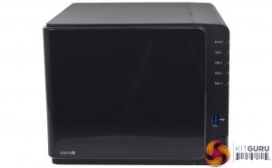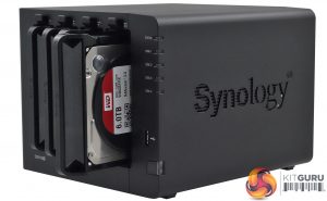 The four vertically mounted drive bays are hidden behind the pull off front panel which allows for easy access. The downside of this is the lack of physical security for the drives, which is something to be aware of if the NAS is in an office.