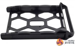 The plastic drive trays themselves are tool free for 3.5in drives but 2.5in drives will need fixing to the bays (enough screws are provided in the box). The larger drives are held in position by plastic strips which have pins on them to go through the holes in the sides of the trays and into the mounting holes of the drive, a simple but very effective tool free design.