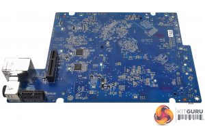The only chips found on the flipside of the board are a pair of Intel WGI211AT ICs which look after the two Ethernet ports. Joining these are two PCIe slots, one supports the backplane that the four SATA ports are mounted on while the other holds the riser card which houses the rear USB 3.0 ports and the eSATA ports. These two USB 3.0 ports are controlled by an EtronTech EJ168A IC mounted on the riser card.