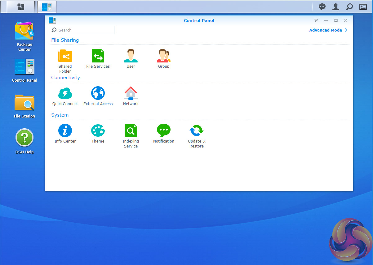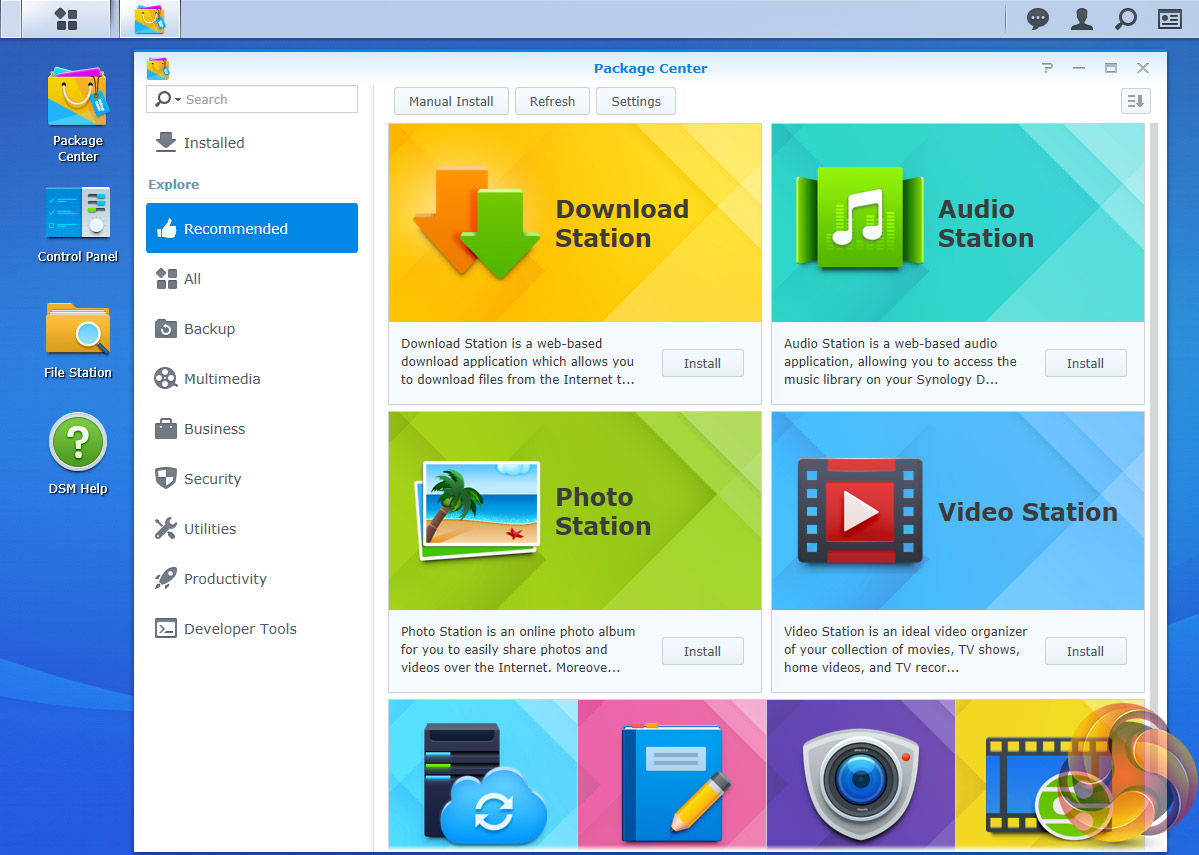 DSM has a graphically rich interface with all the major features of the OS clearly listed. The basic start page just lists four items; Package Center, Control Panel, File Station and DSM help.