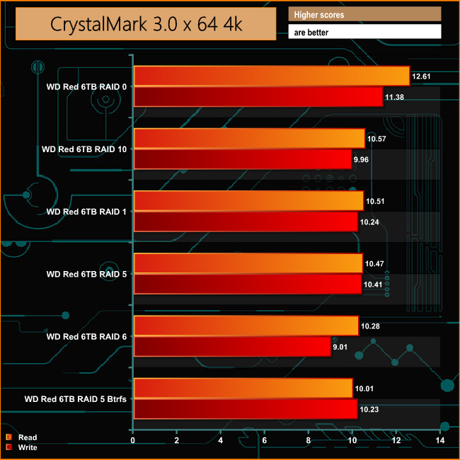 The DS916+ shows a pretty good level of consistency across all the supported RAID arrays when dealing with small bity files averaging just under 11MB/s for reads and 10.38MB/s for writes.