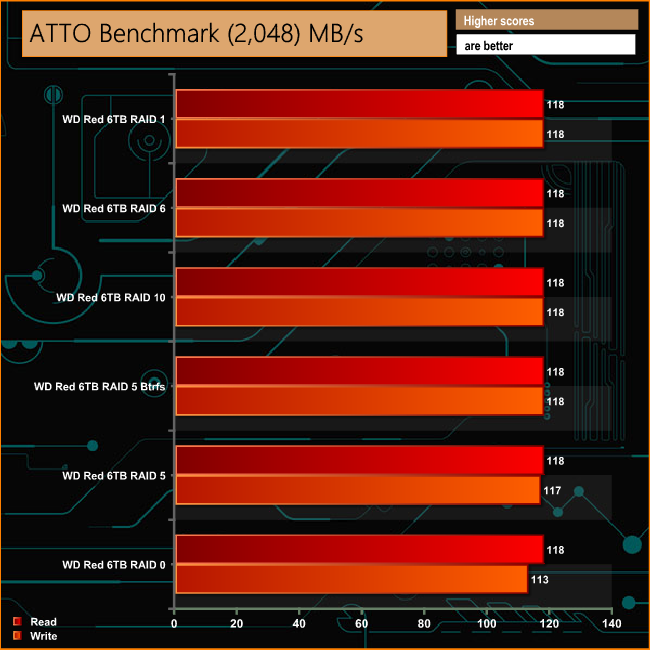 Although Synology quotes Sequential performance figures for the DS916+ of 226MB/s for reads and 222MB/s for writes, this was with both LAN ports in Link Aggregation mode. Using a single LAN link the DS916+ shows great consistency across the arrays, with the read/write performance topping 100MB/s across the board. The write performance drops back a little in RAID 0.