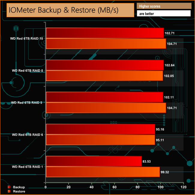 We set IOmeter up (as shown above) to test both backup and restore performance on a 100GB partition.